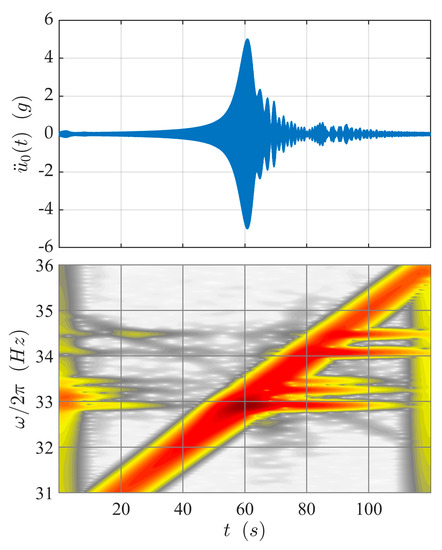 - The inclined straight line crossing the spectrogram is the direct effect of the excitation and can be used to estimate its instantaneous frequency if it is not directly measured. The wavelet transform of Equation (23) is computed along this line.