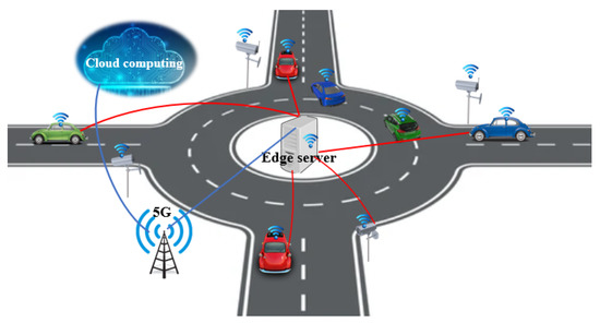 Nowadays, the ideas of smart cities and autonomous/automated driving are strongly related to the interconnection of vehicles with the other traffic participants, smart infrastructure and cloud-computing platforms through the so-called cyber-physical frameworks (CPFs) [31]. This paper is a sequel to our previous work in [32], in which the problem of managing a roundabout with four entries/exits through minimising the waiting times of vehicles was firstly introduced. Moreover, safety constraints were also imposed and the problem was solved using the fmincon Matlab function. In the present work, the novelty is the generalisation of this problem, considering the intersection as having n entries/exits. The main contributions of the paper are the following: (i) proposing a cyber-physical framework to manage a roundabout intersection, the solution having two levels on the cyber plane, which are illustrated in Figure 1: the first level is represented by an edge server and the video cameras from the intersection, while the second level contains a cloud computing platform; (ii) the derivation of an analytical solution to minimise the waiting times of the vehicles and to ensure a safe drive through the roundabout. The first level, i.e., the edge-computing layer, interrogates the vehicles about their exits and receives information from the cameras installed on each entering lane—the data being used to compute the waiting times for vehicles. The second level, i.e., the cloud-computing layer, stores information received from the first layer about the waiting times and trajectories of all the vehicles that cross the roundabout and uses them for long-term analysis and prediction. The proposed solution is based on classical multivariable optimisation techniques, i.e., Lagrange multipliers method and Kuhn–Tucker conditions [33], to minimise the waiting times of vehicles. The same method is used in a manifold of applications to minimise a cost function with constraints, such as [34,35,36]. Among the applications that are based on this method, one can enumerate the following: trajectory planning for unmanned ground vehicles [37], optimal control of a diesel engine [38], minimisation of fuel consumption in a hybrid electric vehicle [39], control of dynamics of a robot manipulator [40] and thermal applications [41,42].