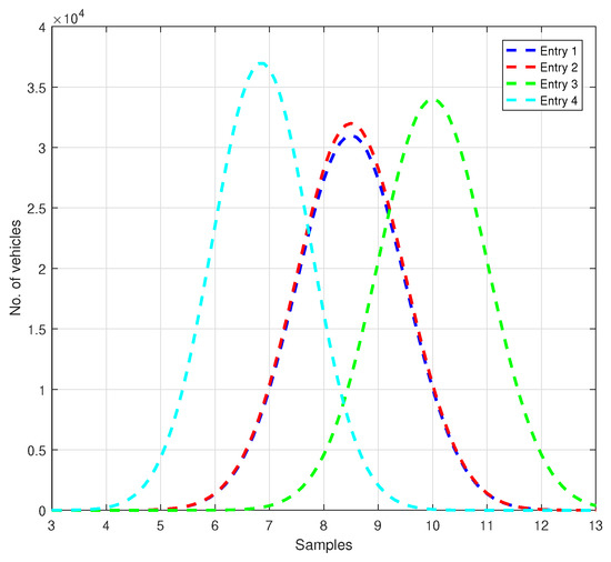 The rates used to generate the vehicles that want to cross the roundabout during an entire day have a Gaussian distribution and are illustrated in Figure 3. For the first entry, the average rate of the vehicles that want to enter is s, for the second— s, for the third— s, and for the fourth entry— s. From this analysis, it results that through entry 2, fewer vehicles want to pass when compared to entry 4 and, at the same time, more vehicles than through entry 3.
