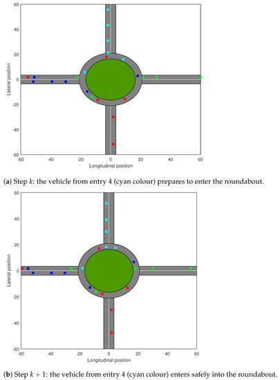 Figure 4 illustrates two consecutive steps (upper and lower sub-figures), from which one can notice that in front of entry 4 (illustrated with cyan colour), a vehicle from entry 2 (represented with red colour) passes. It can be observed that the CM succeeds to compute a waiting time for the vehicle of entry 4 to avoid the collision and to enter the roundabout at a safe distance.