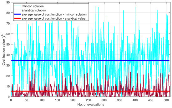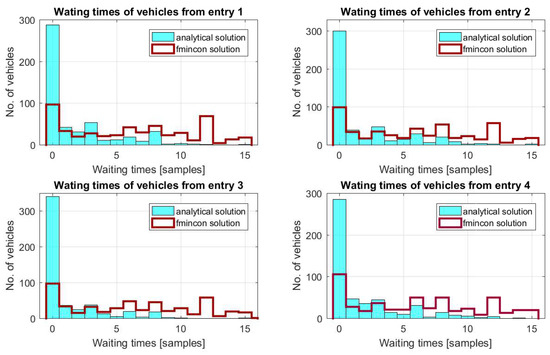 In Figure 5, the waiting times of the vehicles that cross the roundabout are illustrated. Analysing these figures, it can be observed that the values of the waiting times obtained with the analytical solution are lower compared to those obtained by the fmincon solution provided by Matlab. From these figures and Table 2 and Table 3, it can also be observed that the number of vehicles that cross the roundabout has increased. Moreover, in Figure 6, one can observe that a better result is obtained for the solution presented in Section 4.