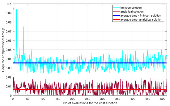 It can be noticed that the results obtained using the multivariable optimisation-based analytical solution proposed in this paper outperforms the results obtained in our previous work [32]. Since the average waiting times for each entry has decreased, this leads to an increased number of vehicles that crossed the roundabout. The simulation was done using Matlab R2016a, on a system equipped with a Core i7 processor and 8GB memory RAM. The computational times for both the proposed solution and the comparative fmincon solution from [32] are illustrated in Figure 7. Because the required computational average time needed by the CM, implemented based on the proposed analytical solution, to obtain the waiting time is smaller than the average time needed by the fmincon function, i.e., 0.0066 s < 0.035 s, results that the proposed analytical solution can be implemented on a real-time equipment with minimum costs. Another advantage is given by its overall implementation simplicity, when compared to the fmincon function.