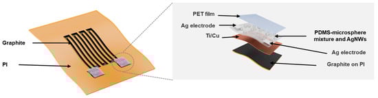 Figure 1 shows a schematic diagram of a flexible integrated bending strain and pressure sensor system. The strain sensor is a graphite serpentine wire patterned by laser sintering on a PI tape, and its two ends are deposited with squared Ti/Cu (20 nm/50 nm) metal films as two electrodes. There are two pressure sensors integrated into the system, which are constructed on the top of the strain sensor’s two electrodes. As enlarged in the right part of Figure 1, the pressure sensor’s key sensing component is a layer of PDMS-expandable microsphere mixture coated with AgNWs. In addition, there are two Ag pads added on the top surface of the layer at both sides to serve as the electrodes for the pressure sensor, and the top of the pressure sensor is covered by a PET film.