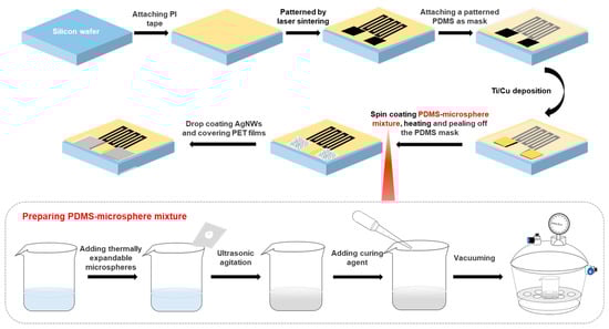 The part in the grey dotted box of Figure 2 shows the process to prepare the PDMS-microsphere mixture. First, Expancel 043 DU08 thermal expandable microspheres were added into the prepolymer of PDMS (Sylgard 184, Dow Corning) at a weight ratio of 0.4%, and ultrasonic agitation was carried out for 2 h to make microspheres dispersed homogeneously in the prepolymer. Then, the curing agent of PDMS was added into the prepolymer at a weight ratio of 10:1, and the mixture was pumped in a vacuum tank until there was no bubbling in the mixture.