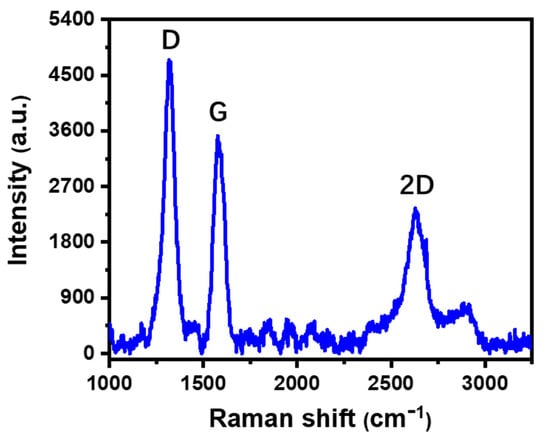 We first checked the morphology of the strain sensor. From the scanning electron microscope (SEM) images shown in Figure 3, it is clear that there were porous graphite microstructures on the surface of PI film, and the carbonized structure contained multilayer graphene flakes []. The carbonization process of the PI film under laser irradiation was most likely by a photothermal mechanism [,], during which the PI film absorbed the incident laser energy and converted it into heat to induce extremely high temperature in the irradiated region to result in carbonization of the film []. Some chemical bonds in the PI film, such as the C-O, C=O and N-C bonds, could be easily broken under this high temperature []. To further confirm the microstructure, Raman spectrum measurement was carried out on the sintered PI film, as shown in Figure 4. It shows three prominent peaks: the D peak around 1350 cm−1, the G peak around 1580 cm−1, and the 2D peak around 2700 cm−1. The spectrum was similar to that of porous graphite microstructures obtained in a previous report [].