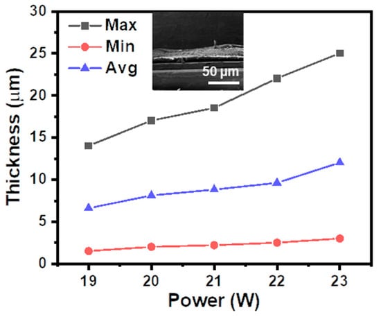 Effect of the laser power on the thickness of the obtained graphite on PI tape surface. Inset: cross-section SEM image of the obtained graphite on PI surface.