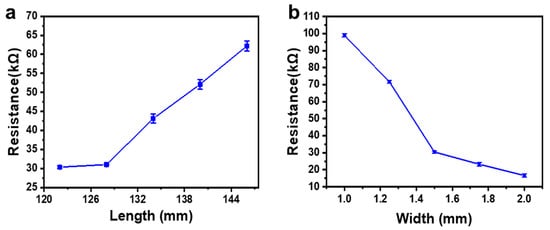 We also checked the main parameters affecting the resistance of the obtained strain sensor, including the length and width of the wires in the serpentine structure. The results are shown in Figure 6a,b, respectively, in which every data point was obtained by average the resistances measured from three identical devices fabricated with the same conditions. As for resistance, R, R = ρL/S, where ρ is the resistivity, L is the length, and S is the cross-sectional area of the wire. The results showed that the resistance of the laser-sintered graphite was proportional to the length of the wire, while inversely proportional to the width of the wire. It should be mentioned that it was not a strict linear relationship as predicted by the above equation. This may come from the scattering-induced interaction area extension at the wire edge during sintering and the uneven thickness of the obtained graphite. Even so, the controllability of the resistance over the geometric dimension was desirable based on this feasible “laser writing” approach which had great flexibility for device design.