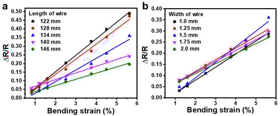 Figure 8a,b shows the relative resistance change, ΔR/R, of the strain sensor with different geometries in response to different bending strains, ε, where ΔR and R are the variation of resistance and the initial resistance of the sensor without strain. The calculated gauge factor, of these devices decreased from 9.54 to 3.5 as the length of the wire increased from 122 mm to 146 mm, while it showed no obvious dependence on the width of the wire when it doubled from 1.0 mm to 2.0 mm. This different dependence on the two geometry factors comes from the working mechanism of the sensor, which is based on the resistance change induced by the relative displacement of flakes in the graphite under deformation []. As referring to Figure 4, when the device was bent, most deformation was introduced along the length direction, and thus the GF of the sensor was significantly influenced by the wire length, while the width of the wire had a negligible effect on the response of the device. When the length of the wire increased, the resistance increased more quickly than the change in resistance variation under deformation, resulting in a decreased GF with increased wire length.