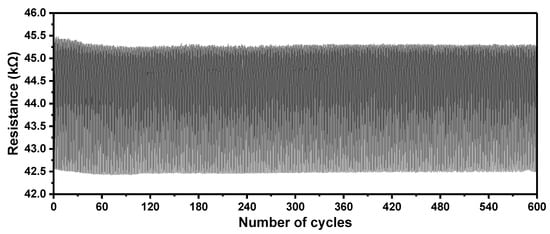 Mechanical stability test of the strain sensor under 600 loading-unloading cycles of a 5.6% bending strain.