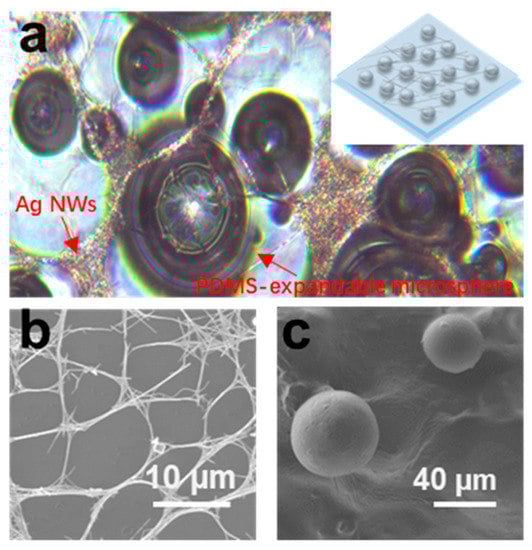 (a) Optical image of PDMS-expandable microsphere structure covered with AgNWs. The inset: Schematic image of the structure. SEM image of (b) the distribution of AgNWs and (c) the morphology of microspheres after expansion.