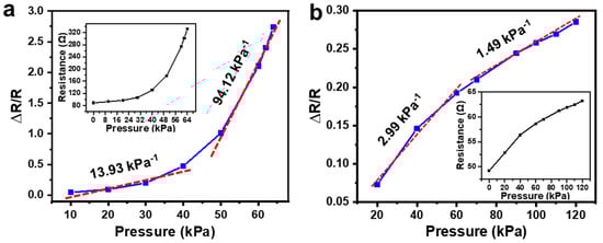 Pressure response of pressure sensors fabricated with a AgNWs solution concentration of (a) 0.3 mg/mL and (b) 0.6 mg/mL. Insets, measured resistance change with applied pressure.