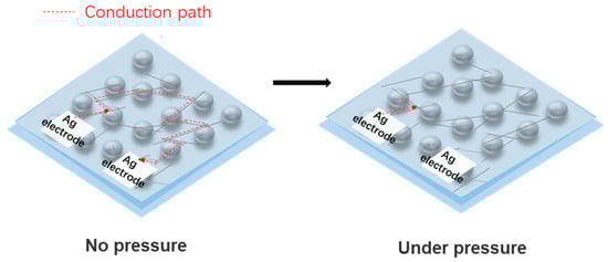 We tested devices fabricated with two different concentrations of the AgNWs ethanol solution, 0.3 mg/mL and 0.6 mg/mL. The results are shown in Figure 11a,b, respectively. The two insets show the resistance change in the two sensors with different applied pressures. It should be mentioned that for the device fabricated with a lower concentration of AgNWs, the resistance became too large to measure when the applied pressure increased to be over 60 kPa. This may be due to the broken of AgNWs network connected at a low density, which results in the shutdown of the conduction path between two Ag electrodes. The sensitivity of the device, S, is calculated as , where P refers to the applied pressure. Clearly, these two curves in Figure 11a,b can both be divided into two regions according to different sensitivities after linear fitting. For the device fabricated with a lower concentration of AgNWs, sensitivity of 13.93 kPa−1 and 94.12 kPa−1 were achieved between 10–40 kPa and 50–60 kPa, respectively. While for the device fabricated with a higher concentration of AgNWs, the sensitivity was 2.99 kPa−1 and 1.49 kPa−1 for the pressure range of 20 to 60 kPa and 70 to 120 kPa, respectively. Thus, a lower density of AgNWs networks is preferred to obtain a sensor with high sensitivity in a limited working range, while a higher density of AgNWs networks is desired to achieve a sensor with a large working range but moderate sensitivity. This is because that, as shown in Figure 12, the device with a lower density of AgNWs networks, the conduction paths between two Ag electrodes are very limited; here, only one path is formed in the schematic diagram, and the resistance measured between the two electrodes can be changed greatly under pressure due to significantly reduced number of conduction paths, which results in a high sensitivity but with a limited working range. While for a device with a higher density of AgNWs networks, the original conduction paths are abundant, and shutdown of several conduction paths under pressure has a very small effect on the resistance between the two electrodes, which leads to a lower sensitivity of the sensor, but it can work in a large pressure range. So, by choosing a proper concentration of AgNWs solution, we can design a pressure sensor with high sensitivity, a large working range, or a compromise between these two characteristics according to the application requirements.