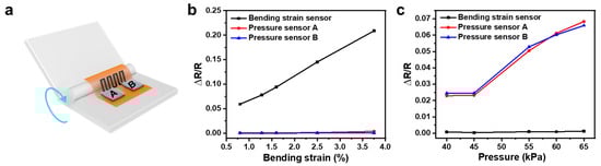 For the integrated system, we first checked the crosstalk between different sensors. The experimental setup is sketched in Figure 13a. When the bending strain was introduced into the system, a linear increase in the relative resistance with strain was observed in the bending strain sensor, while there was almost no response in both pressure sensors A and B, as shown in Figure 13b. Meanwhile, when there was only pressure applied, all the responses happened in the pressure sensors, while the resistance in the bending strain sensor was almost unchanged, as shown in Figure 13c.