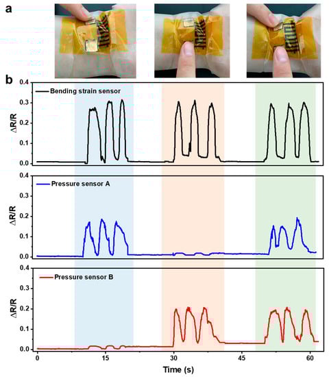 Finally, the integrated system was attached to a person’s wrist for motion monitoring, as shown in Figure 14a. Figure 13b shows the recorded signals from different sensors during different actions. First, the wrist was bent three times, and pressure sensor A was also pressed three times at the same time. As highlighted by the blue strip, the bending strain sensor and pressure sensor A showed three responses correspondingly, while there was no crosstalk signal in pressure sensor B. Then, the wrist was bent three times, and pressure sensor B was pressed, and distinct responses were recorded in the corresponding sensors, as highlighted by the orange strip. Finally, the wrist was bent, and two pressure sensors were pressed together three times. All the sensors showed proper responses (highlighted by the green strip). During these actions, almost no crosstalk was observed between different sensors, and the discrimination of different actions by the integrated system is pretty good.
