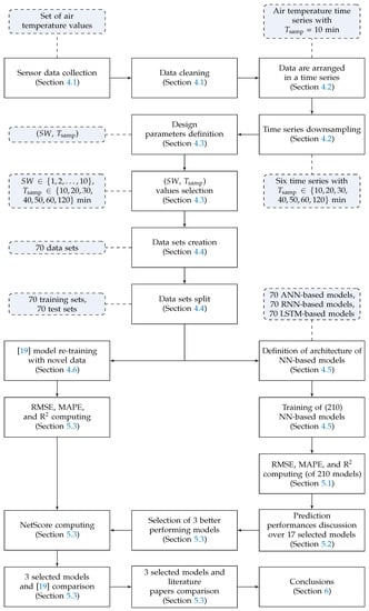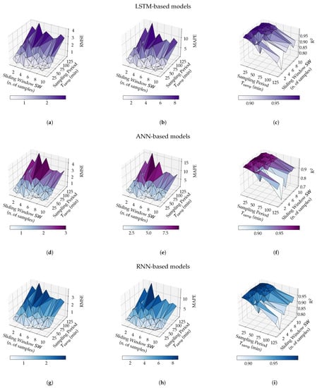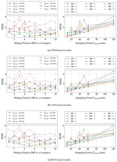 - The number of input variables of the model and the sampling period are defined as the two design parameters. Moreover, is reintegrated as the prediction time horizon; in fact, the predicted temperature value is the one corresponding to the next temperature value after the most recent one of the sliding window: this samples is, by construction, ahead. Furthermore, a proper set of values related to these parameters is selected for testing purposes (Section 4.3).