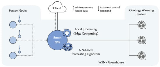 - Thirdly, complex models and/or forecasting algorithms are developed with the goal of predicting the future values of the monitored environmental variables, for example allowing us to preemptively schedule some operations (e.g., the activation of a warming system) to avoid these internal variables reaching undesired conditions (i.e., too low temperatures). To this end, the greenhouse’s internal variables have been satisfactorily forecast through Deep Learning (DL) algorithms, e.g., based on Neural Networks (NNs) [14,15,16], and selecting data collected from different sources as input (namely, internal and external variables of a greenhouse, possibly measured by SNs).