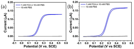 The FCA limiting current was estimated to be 0.157 µA using Equation (2), which is similar to that found experimentally and confirms that individual radial diffusion layers occur at each microdisc in the array. Essentially, the diffusion layers at individual microdiscs are unperturbed by the diffusion layers of the neighbouring electrodes, resulting in enhanced voltammetric performance. Control CV experiments in the absence of FCA were performed in PBS buffer, only, at 10 mV s−1 (grey response in Figure 4a). No faradaic current was observed, but a negligible background current (typically 1–2 nA) was measured.