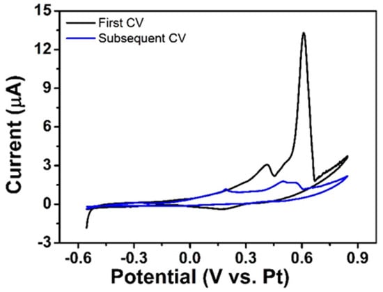 The CV response of an as-received VentolinTM formulation containing 6.94 mM (2 mg/mL) salbutamol (as sulphate) in 15.4 mM NaCl and 0.05 mM H2SO4 solution at pH 4 recorded at an NPG-modified microdisc electrode using the on-chip Pt reference electrode is shown in Figure 5. Two well-defined peaks were identified in the initial anodic scan at 0.41 and 0.61 V, but no corresponding cathodic peaks were observed on the reverse scans, which would suggest that an irreversible reaction, or an electrochemical reaction followed by a chemical step (EC), was associated with each peak. The minor peak at ca. 0.15 V was most likely related to the reduction of gold oxide formed at potentials above 0.70 V. The peaks at 0.41 V and 0.61 V are assigned to chloride and salbutamol oxidation, respectively, with the peak separation of 0.20 V being sufficiently large enough to distinguish the presence of these two species. Second and subsequent CVs demonstrated significant decay in current (blue response). This is in agreement with studies of salbutamol oxidation reported in the literature, which describe an irreversible one electron, one proton oxidation reaction coupled to subsequent fouling of the electrode surface by salbutamol’s oxidation product [34].