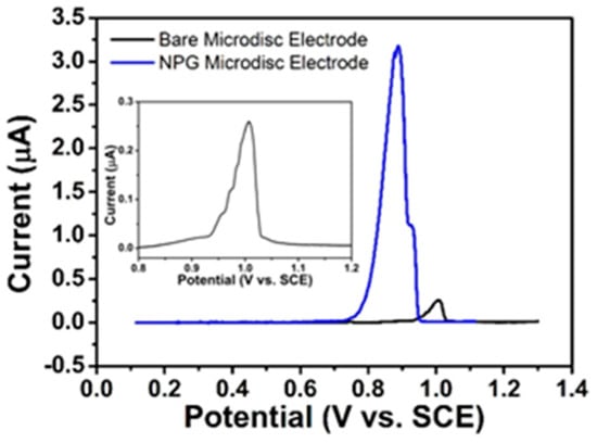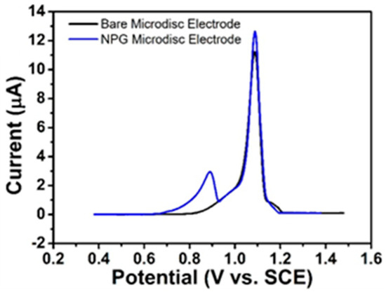 LSV studies in the background solution (i.e., 0.0154 M NaCl and 0.05 mM H2SO4) at bare gold- and NPG-modified microdisc array electrodes were performed vs. SCE over a suitable potential range at 10 mV s−1. As can be seen in Figure 7, a single peak tentatively assigned to the adsorption of chloride ions was recorded in the background solution at 1.005 V and 0.88 V at bare gold and at NPG electrodes, respectively.