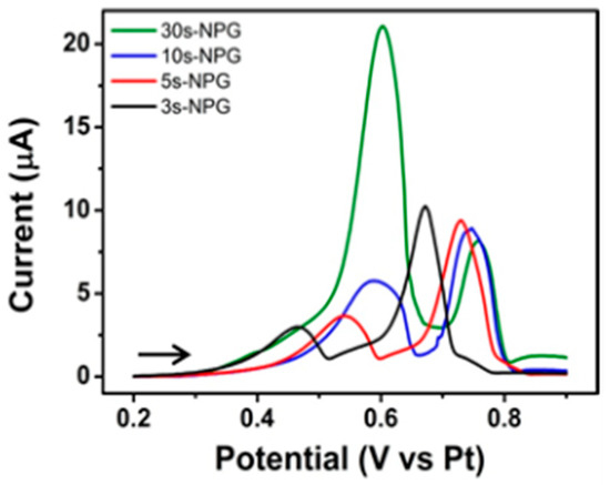 The promotion of electron transfer kinetics has been reported in the literature for several other molecules at NPG that undergo kinetically sluggish electron transfer reactions, as evidenced by the cathodic shift in potential for oxidation reactions (and anodic shift for reduction reactions) at NPG relative to bare gold [75,76,89,90,91,92,93]. Most recently, Kumar et al. [89] noted the enhancement in electron transfer kinetics of ascorbic acid at NPG over bare gold (the oxidation wave shifted by 0.30 V to less positive potential at NPG relative to bare gold), which they attributed to the porosity of NPG and to the evolution of low index and higher surface energy crystalline planes. Moreover, the presence of (220), (200) and (311) planes were confirmed at higher intensity at NPG by XRD, which is expected for materials with a higher density of electrocatalytically active sites. The evolution of such low indexed crystalline planes in NPG is in contrast to the (111) plane exposed in bare gold. Similarly, the onset potential for oxidation of glucose, galactose and mannose were approximately 0.10 V lower at Au(100)-enhanced NPG than at bare gold in a recent study [90]. The authors further highlighted the influence of crystallographic orientation on the onset potential for the monosaccharide oxidation reactions, with a lower onset potential at Au(100)-enhanced NPG than at Au(111)–NPG. Much earlier, the enhanced electron transfer kinetics for oxidation of surface-confined nitrite and L-cysteine at NPG relative to bare gold were evidenced in the cathodic shift in their oxidation potentials by Ge et al. [70] and Liu et al. [91], respectively. Similarly, in the case of the reduction of hydrogen peroxide and oxygen, an anodic shift in potential was recorded at NPG relative to bare gold [92,93].