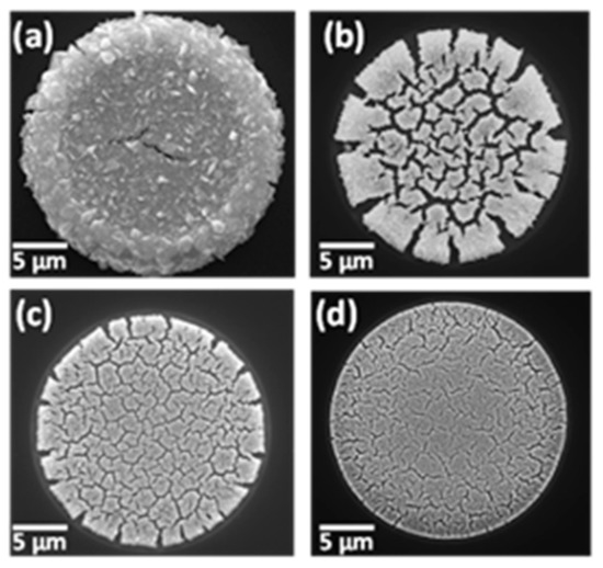 The differing response of NPG to salbutamol and chloride as a function of their intrinsic electron transfer rates is another example of the ‘discriminative’- or ‘selective current amplification’ previously attributed to nanoporous electrodes [101]. The nanoconfinement effect associated with chloride leading to its selective amplification at NPG was confirmed experimentally in Figure 9 by varying the NPG deposit thickness (and, hence, its available surface area) in the microdisc array and observing the change in the LSV response for salbutamol and chloride in VentolinTM formulations. The current associated with chloride adsorption increased with NPG deposit thickness, yet the salbutamol oxidation current remained almost constant. It should be noted that there is some variability in the peak potential for salbutamol and chloride signals due to the slight instability of the platinum quasi-reference electrode. The SEM images corresponding to the NPG-modified microdisc arrays of varying thickness are shown in Figure 10. Deposition of the precursor Au0.18Ag0.82 alloy for 30, 10, 5 and 3s, followed by etching in 25% nitric acid for 30, 6, 3 and 2 min, respectively, yielded NPG deposits of 1.6, 1.0, 0.7 and 0.28 µm thickness, respectively. The deposition was found to be affected by the shape of the microdisc such that somewhat thicker deposits formed at the periphery of the microdisc while thinner deposits formed in the central area. This is due to differences in the current flow; it flows more densely to sharp edges than to the less accessible recessed areas.