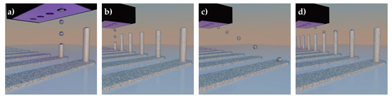 The growth of pillar structures using pico-liter droplets of Ag nanoparticle (AgNP) ink was investigated for printing 3D microelectrode arrays (MEAs). Two different printing methods were initially investigated, as illustrated in Figure 1. The first method deposited individual droplets of ink in a stationary environment, to control alignment and ejection frequency for droplet drying, which are key for stacking the AgNP ink into a 3D pillar [70]. Due to the droplets’ small volume, surface tension has a much larger influence than gravitational forces (low Bond number), allowing the formation of 3D structures without the need for intermediate layer sintering stages [75]. However, a significant issue of a stationary system is the throughput of this method, as this allows only one pillar to be printed at a time. This is not ideal for a high throughput production of 3D microelectrode arrays. Therefore, the second method utilized a moving print head to allow multiple pillars to be fabricated in parallel.