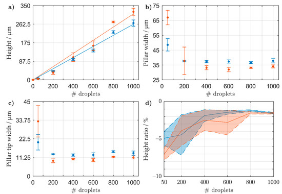 Profilometric data of unsintered pillars printed with a drop to drop (DtoD) delay of 4.1 (red) and 7.5 s (blue) on a heated sample stage (60 °C) and nozzle plate (55 °C). 50 to 1000 droplets of AgNP ink were printed and the pillar’s (a) height, (b) pillar width, and (c) pillar tip width were measured. (d) Relative change in height between sintered and unsintered pillars for both DtoD delays. The average height reduction ratio (solid lines) and standard deviation (dashed lines and shaded areas) for each number of droplets was calculated using 8 pillars. A linear fit with a set y-intercept at a height of zero was applied to (a) showing an incline of 262 ± 6 nm droplet−1 (blue) and 311 ± 11 nm droplet−1 (red).