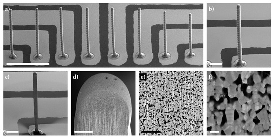 Tilt-corrected scanning electron microscope images of (a) a sintered 3D microelectrode array, (b) a pillar under focused ion beam analysis, and (c) a pillar after bulk milling and polishing. Different magnifications of the pillar shown in (c) are shown in (d–f). All pillars were printed with approx. 1600 droplets of AgNP ink, displaying a width of ~32 μm and a height of 500–560 μm. All images were captured using an acceleration voltage of 3 kV and a substrate tilted at 52–54°. Scale bars represent (a) 500 μm, (b) and (c) 100 μm, (d) 10 μm, (e) 1 μm, and (f) 100 nm.