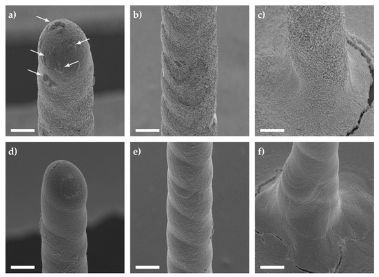 Tilt-corrected scanning electron microscope images of Au galvanized pillars using (a–c) constant and (d–f) pulsed electrodeposition. A constant potential of −1.15 V was applied for 300 s in comparison to a pulsed potential (−1.15 V for 20 ms, 0.4 V for 70 ms, 0 V for 10 ms vs. Ag/AgCl (3 M NaCl) reference electrode) with 15,000 cycles. The tip (a,d), middle (b,e), and base (c,f) were imaged using an acceleration voltage of 15 kV, a magnification of 1000×, and a substrate tilted at 45°. The scale bars shown in (a–f) correspond to a length of 20 μm.