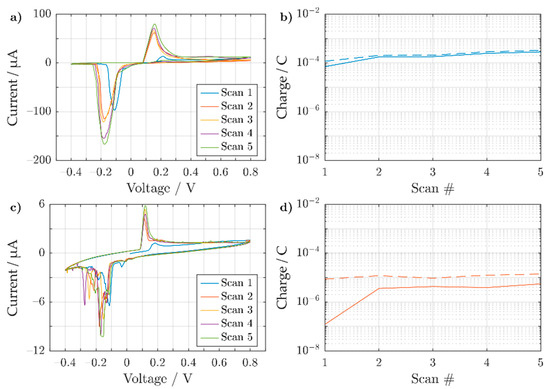 Oxidation and reduction peaks were found on the silver 3D electrode (shown in Figure 5a around 149 ± 4 mV and −177 ± 3 mV vs. Ag/AgCl (3M NaCl), respectively (values averaged over scan 3–5). The most probable reason for the peaks’ existence is due the buffer’s high chloride concentration, which allows the redox reaction to occur.