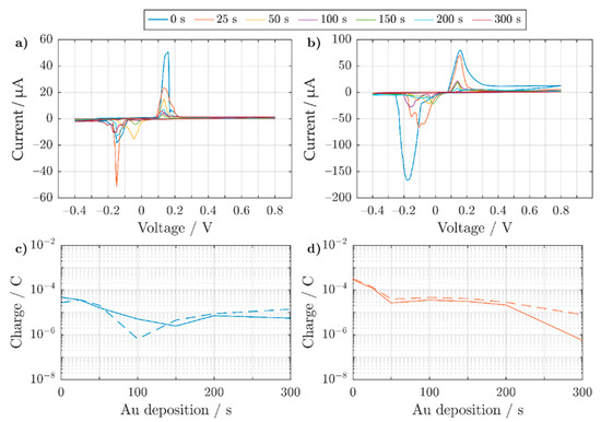 Cyclic voltammograms showing the 5th cycle response of Au galvanized 3D electrodes in PBS, using (a) constant and (b) pulsed electrodeposition. All 3D electrodes were of similar size with an exposed height of ~450 μm in electrolyte. Each trace represents an electrode, which was Au coated for a different effective deposition interval from 0 to 300 s. The same scan rate of 50 mV s−1 was used for each trace. (c,d) show the back-calculated charge for oxidative (solid lines) or reductive (dashed lines) processes occurring after constant and pulsed electrodeposition, respectively.
