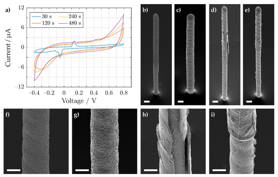 (a) Cyclic voltammogram showing the 5th cycle response of Ag–Au–Pt 3D electrodes in PBS. Each trace represents an electrode, which was first coated with Au for an effective deposition interval of 200 s and then further coated using Pt for an effective reduction time of 30, 120, 240, and 480 s (both used a PED protocol for electroplating). After cyclic voltammetry, tilt-corrected SEM pictures of the same 3D electrodes with different Pt deposition times are shown: 30 s (b,f), 120 s (c,g), 240 s (d,h), and 480 s (e,i). A magnification of 180× and 1000× was used for (b–e) and (f–i), respectively. All images used an acceleration voltage of 15 kV and a substrate tilted to 45°. The scale bar shown in (b–e) and the scale bar shown in (f–i) correspond to a length of 40 and 20 μm, respectively.