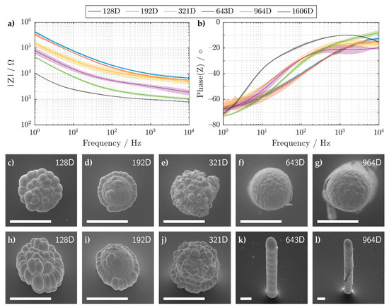 Electrochemical impedance spectroscopy was used to characterize the 3D electrodes’ suitability for cell recordings. To this end, electrodes with varying heights were printed and electroplated with Au and Pt (fabrication method shown in the Supporting Information). Their impedances measured in PBS, along with corresponding SEM images, are shown in Figure 8. Depending on the droplet number, either semi-spherical or pillar structures can be fabricated. For droplet numbers below 643D, a smaller electrode opening was formed after passivation. After the Pt galvanization process, cauliflower patterns are visible, which arise due to overlapping primary diffusion zones [88].