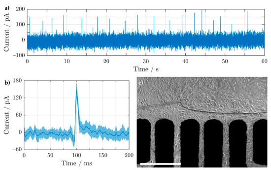 In order to test the 3D electrodes’ biocompatibility and functionality for future cell experiments, cardiomyocyte-like cells (HL-1) were cultivated on similar 3D electrodes, as shown in Figure 8e,j. This electrode size was chosen as it exhibited a low enough amplifier noise, while still maintaining a prominent 3D shape. This was due to the recording setup, which measured the extracellular potentials of the HL-1 cells amperometrically, by exploiting the capacitive nature of the electrodes (view Figure S7 for more information). After 3 days in vitro, the cells reached confluency and extracellular recordings were performed as shown in Figure 9. The extracellular activity of the HL-1 cells was induced using norepinephrine and later stopped by injecting sodium dodecyl sulfate (SDS), which kills the cells. In order to avoid interfering Faradaic reactions (e.g., oxidation of norepinephrine [89]), a bias potential of 0 V vs. Ag/AgCl (3 M NaCl) was applied. The spiking activity of the cells is shown in Figure 9a and the average and standard deviation of the extracellular potentials are displayed in Figure 9b. Finally, Figure 9c shows the confluent cell layer surrounding the electrodes where the extracellular potentials were measured.