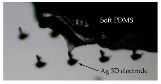 Silver 3D electrodes (sintered at ~220 °C) with a width and height ~30 µm and ~300 µm penetrating into soft PDMS (Sylgard 527, Dow Corning).