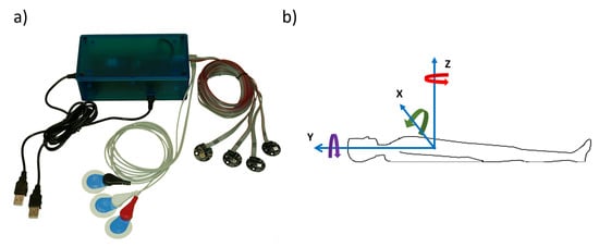 Our new multinodal Motion Measurement System (MMS)—depicted in Figure 1a—consists of a central unit, and four peripheral MEMS sensor nodes and three ECG electrodes. Each of the MEMS sensor nodes contains a BMI160 IMU unit (Bosch Sensortec GmbH, Reutlingen, Germany) and a three-axis ADXL355 accelerometer (Analog Devices, Inc., Wilmington, MA, USA). Each BMI160 unit contains a 3D accelerometer and a 3D gyroscope. It should be noted that in this work we only consider sensors and not actuators based on MEMS technology—that is, we only intend to measure motions and changes in positions and orientations, and not to induce any such changes. In the following we used the data acquired from the accelerometers of the ADXL355 sensors and the gyroscopes of the BMI160 sensors, since the noise floor of the ADXL355 sensor is significantly lower than that of the BMI160 accelerometer. The data from the BMI160 sensor were acquired at the sampling rate of 400 Hz; the acquisition range for the gyroscope was ±125 degrees per second. The data from the ADXL355 sensor were acquired with the sampling rate of 500 Hz, with the acquisition range of ±2 g (where g is the gravitational acceleration). The central unit of the measurement system is based on the Nordic Semiconductor nRF52840 development kit. The central unit takes care of the communication to and from the sensor nodes and electrodes, and encapsulates the data samples into packets. The measurement system sends timestamped packed binary data through one megabaud serial connection via USB connection to the PC, where the data were saved. The created file containing binary packets was then converted to SI units with timing information, and stored in a Matlab MAT-file for further processing using Matlab or Python.