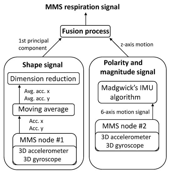 The literature on MEMS-based respiration monitoring can be divided into three subsets based on which sensors are considered. Some ([,,,]) articles consider only the use of a single accelerometer to estimate the breathing rate or the respiratory motion. More recent articles typically consider using an IMU which contains an accelerometer and a gyroscope ([,,,,,]), or an accelerometer, a gyroscope and a magnetometer ([,,]). In addition to these, a method for estimating respiratory motion using only a magnet and a MEMS magnetic sensor is presented in []. The number of MEMS sensors used form estimating respiratory motion varies between studies. Methods utilizing multiple IMU sensors apply common mode filtering [,,,,], independent component analysis (ICA) [], or a kinematic joint model [] to achieve position independence or to mitigate motion artifacts during exercise.