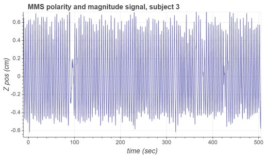 where g is the value of the gravitational acceleration. The respiratory acceleration is then numerically integrated as a cumulative sum weighted by the time between successive samples, and high-pass filtered using a second-order Butterworth filter with a cutoff frequency to obtain an estimate of the respiration velocity. The velocity signal is again numerically integrated and high-pass filtered with a second-order Butterworth filter with the same cutoff frequency to obtain an estimate of the respiration position. Figure 4 presents the polarity and magnitude signal for subject 3.
