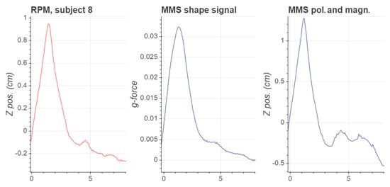 RPM and MMS waveforms corresponding to a single respiratory cycle at scan time t = 0 s–8 s for subject 8.