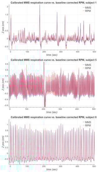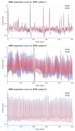 As can be seen, the respiratory signal of subject 1 contains notable inspiration peaks. After some of these major peaks, it takes a few respiration cycles for the MMS signal to recover its periodicity. Respiration signals of subject 5 are more stable, and the MMS signal’s phase seems to align very well with RPM. However, the magnitude of the MMS signal is approximately greater than the magnitude of the RPM signal. A possible reason for this is that the RPM marker could have been located at a position on the body which moved less due to respiration than the MMS sensor node. For subject 8, both the phase and the magnitude of the MMS respiration signal seem to match well with the RPM respiration signal, but there is a slight baseline difference between the signals.