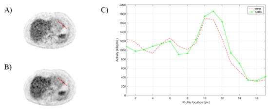 A visualization of (A) MMS-gated, (B) RPM-gated reconstructed PET images showing the region of the hot spot and (C) profiles between the MMS-gated and RPM-gated reconstructed images.