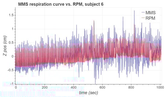 MMS vs. RPM respiratory waveforms for subject 6. The MMS signal quality deteriorates significantly in the second half of the measurement due to poor attachment of the sensor nodes.