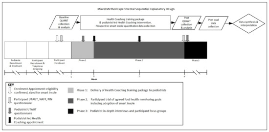 A quantitative dominant (QUANT-qual) mixed-methods intervention with an explanatory sequential core design was utilised (Figure 1) [28]. Ethics approval was granted by Goulburn Valley Health Human Research Ethics Committee (GVH-2019-171432(v2)) 28 June 2019 and La Trobe University Human Research Ethics Committees (HEC19148) 7 June 2019. The trial was registered with the Australian New Zealand Clinical Trials Registry ACTRN12618002053202. Figure 1 illustrates the study design, procedure, and timeline. The interventional components occurred over a 5-week period during phases 1 and 2, with phase 3 conducted in the month following the intervention.