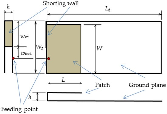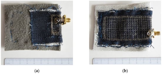 The drawing of the PIFA is shown in Figure 1, and the dimensions of the manufactured textile prototype (shown in Figure 2) are patch W × L = 30 mm × 16 mm and ground plane Wg × Lg = 32 mm × 70 mm. The shorting wall width is wsw = 16 mm, and the feed position is wfeed = 7 mm. The antenna height is h = 4 mm. The conductive parts (patch, ground plane, and shorting wall) of the PIFA were realized by embroidering rectangular mesh of conductive threads [] in denim textile rather than by dense embroidering. The general size of the mesh was 3 mm × 3 mm. Denser mesh was used at locations of higher current density (e.g., edges) predicted by the CAD tool (Figure 2). The substrate is realized by one layer of fleece with εr = 1.17, resulting in total antenna thickness equal to h = 4 mm.