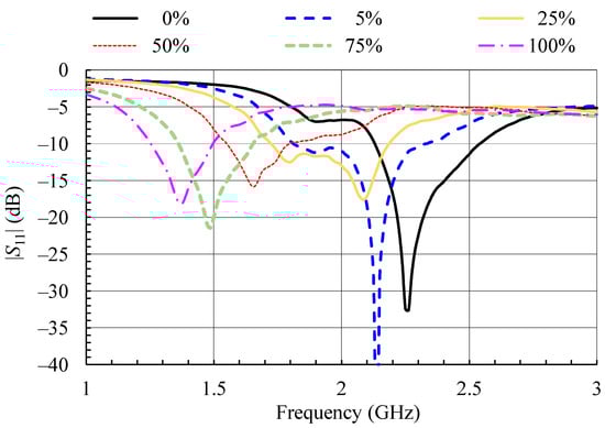 The reference in Figure 5 is the plot for 0% moisture. It shows that the PIFA is well matched in ISM 2.4 frequency band. A 5% increase in moisture content shifts the resonant frequency of the PIFA from 2.2625 to 2.1375 GHz, namely, by 5.5%. At 25% moisture content, another, lower resonance is formed (Figure 5). By further increasing the moisture content the lower resonance becomes dominant and further decreases in frequency with moisture content increase. At moisture content of 100%, the resonant frequency of the PIFA is shifted for more than 39%, i.e., to 1.3750 GHz.