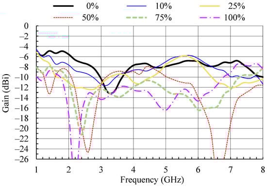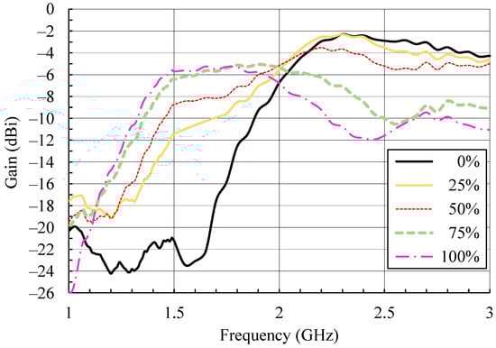 The reference plot for 0% moisture in Figure 6 shows that the dry PIFA at resonance has a gain of −2.7 dBi. This is about 3 dB lower in comparison to the gain of an equivalent metallic PIFA []. The lower gain of the textile antenna is caused by the conductivity of the yarn used for embroidering that is about two to three orders of magnitude lower in comparison to the conductivity of solid copper. The PIFA gain remains largely unchanged up to moisture content around 50%, beyond which it appears to monotonically reduce and reaches −10.5 dBi at 100% moisture content. The conclusion based on these measurements is that the main effect of increased moisture is that it detunes the textile resonant antenna, while antenna gain reduction becomes significant only with larger moisture content.