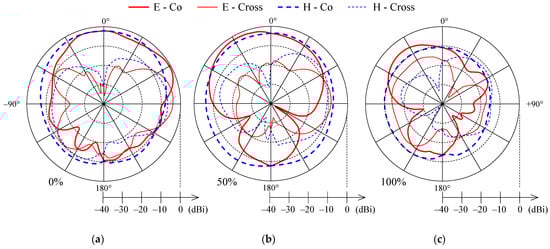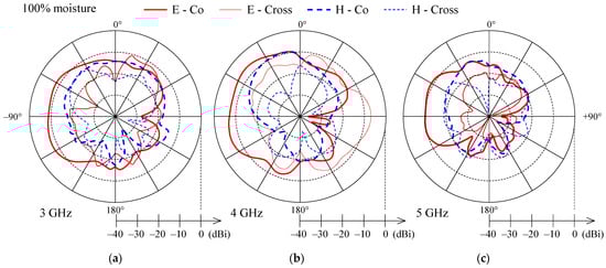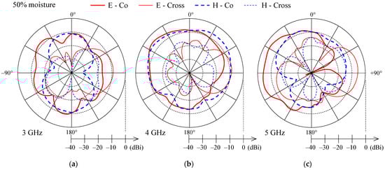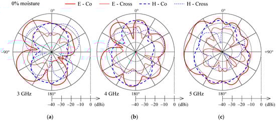 H-plane co-polarization gain patterns for 0%, 50% and 100% moisture contents (Figure 10, Figure 11 and Figure 12) show nearly omnidirectional radiation. Cross-polarization levels (Figure 10, Figure 11 and Figure 12) are high and, at some off-broadside angles, exceed the co-polarization ones. However, for antennas which will be integrated in clothes and used on the user’s body, this should not be a drawback, as body movement, antenna bending, and crumpling, as well as complex propagation environment, will anyhow affect the polarization of the radiated and received wave.