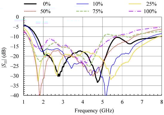 The results for the measured input reflection coefficient of the wideband textile monopole for different moisture contents are shown in Figure 8. The reference is the plot for 0% moisture. For the dry case, the textile monopole has good impedance matching (|S11| < −10 dB) in the band from 1.665 to 7.860 GHz, so the design goal of operation in both ISM 2.4 and 5.8 bands was met.