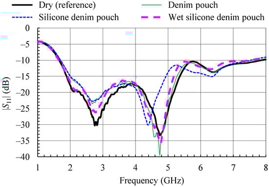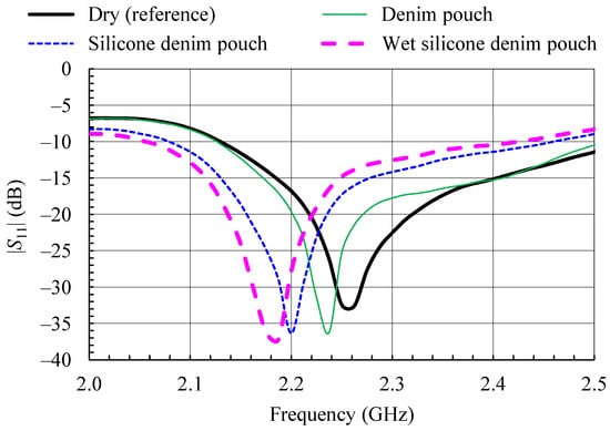 Measured magnitude of the input reflection coefficient of the textile PIFA for different moisture contents [,].