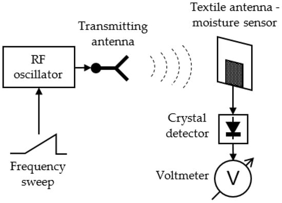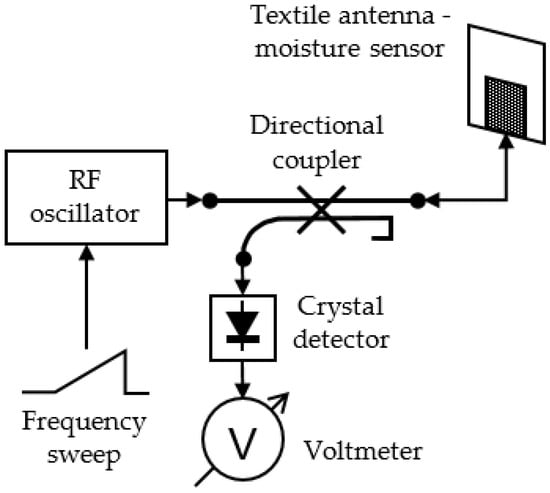 Only the textile antenna used for moisture sensing is placed in the space where moisture should be sensed and the reflection at its input port is measured. Here the textile antenna—moisture sensor—is excited from a swept RF oscillator. The wave reflected at the antenna input port is extracted by a directional coupler and sensed at the coupled port by a crystal detector. The antenna resonant frequency is determined from the minimum absolute value of the measured voltage, as at resonance the reflection is minimal. The calibration curve connecting the resonant frequency and moisture content is the same as for the transmission mode moisture measurement setup (Figure 17).